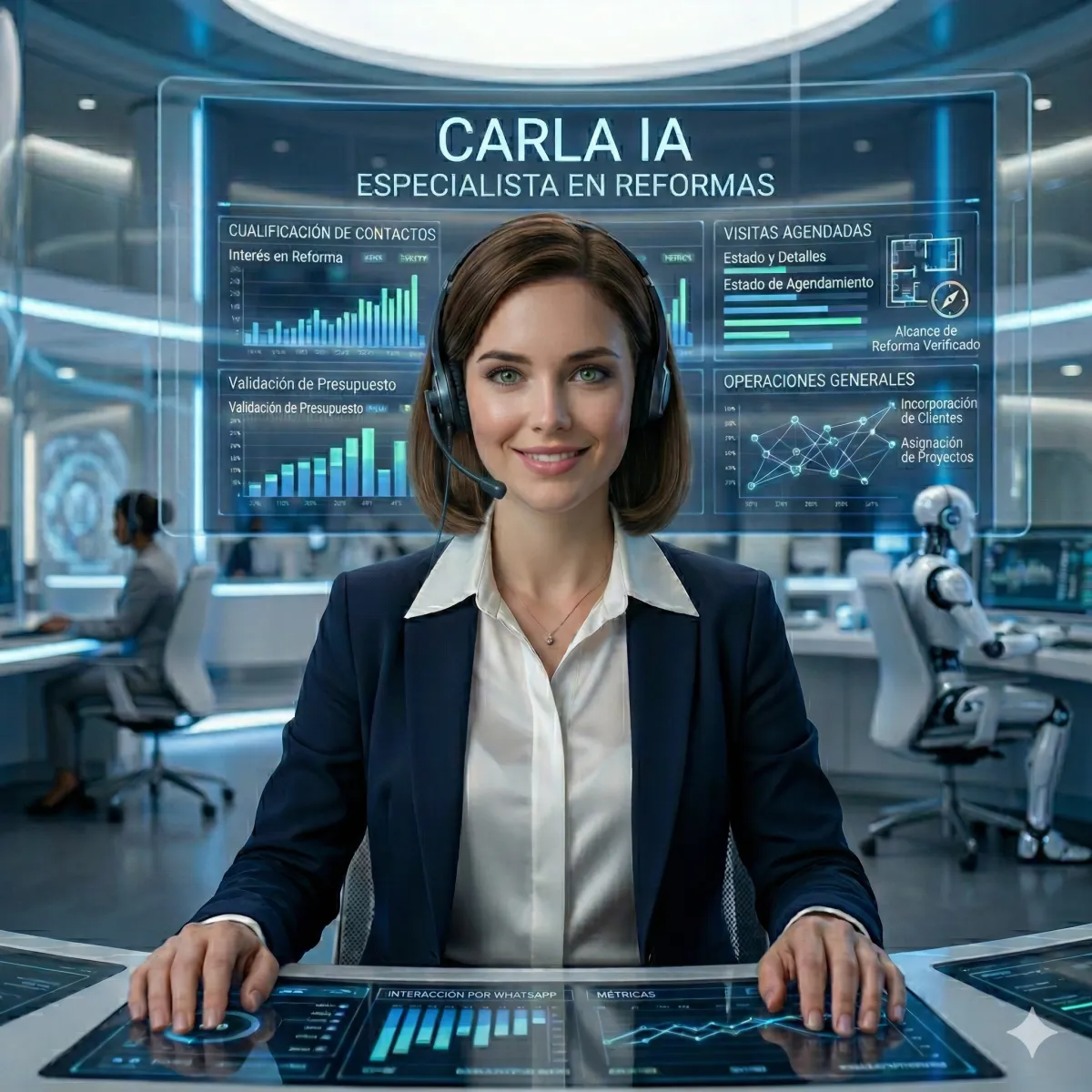 Carla es nuestra IA entrenada específicamente para reformas. En el momento en que entra un contacto, le escribe por WhatsApp al instante, le hace las preguntas clave, filtra si es buen cliente y agenda la visita directamente.